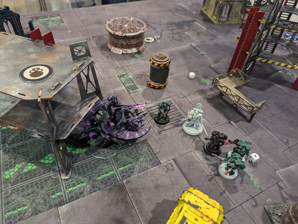- My big expensive 20-man warrior blob got bogged down in melee with a small unit of Reivers. They could regenerate faster than the marines could cut them down, so they were never in any real danger, but they were stuck in place and being so bad in combat meant it took several turns to chip through the marines’ armour until I eventually fell back with the warriors and let another unit finish off the Reivers with shooting. In retrospect I should have done that much earlier and continued to push up the board with the warriors.