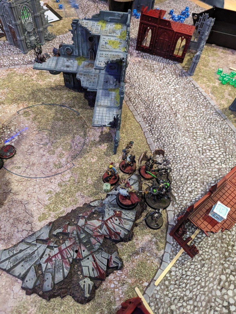 The warriors fell back, but couldn’t then do much. The Alpha Legionaries charged into the mid-ground, cutting down the Saboteur and taking the point, but were reduced to two members in the process (-2 from Saboteur bombs, -1 from the Champion’s overcharged plasma pistol blowing up).
