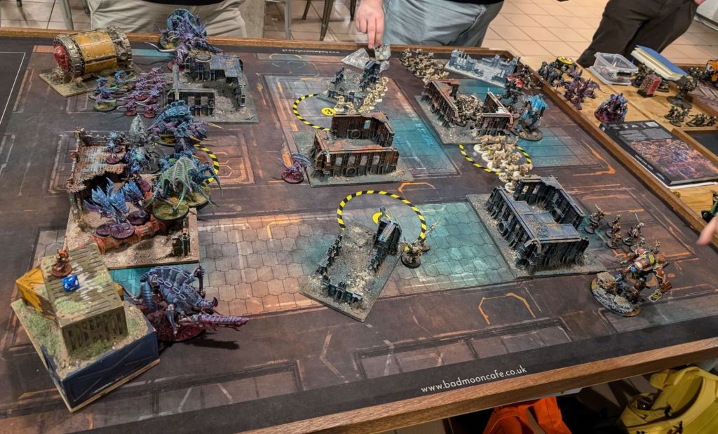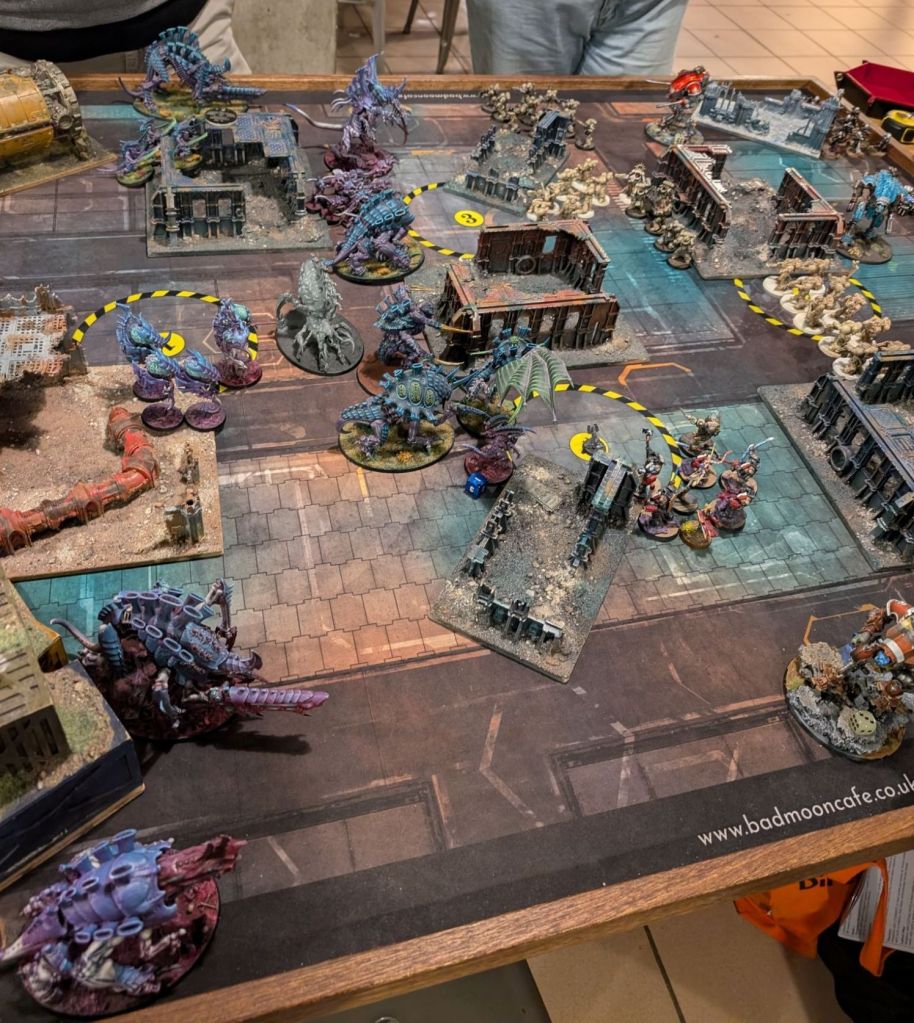 One of the Armigers was cut down by a Tyrannofex but this success was not repeated on the other flank where the living artillery failed to do any damage. The Hive Tyrant was killed by the Inquisitor, marking the first complete objective for the Imperial side. Imperial fire also caused further injury to the Norn Emissary but it still lived, defiantly claiming key ground and, appearing bolstered by this, slew all but one of the Infernus Marines. The skies darkened as a mass of Gargoyles descended, forming a living barrier between the remaining Terminators and the Neurotyrant.