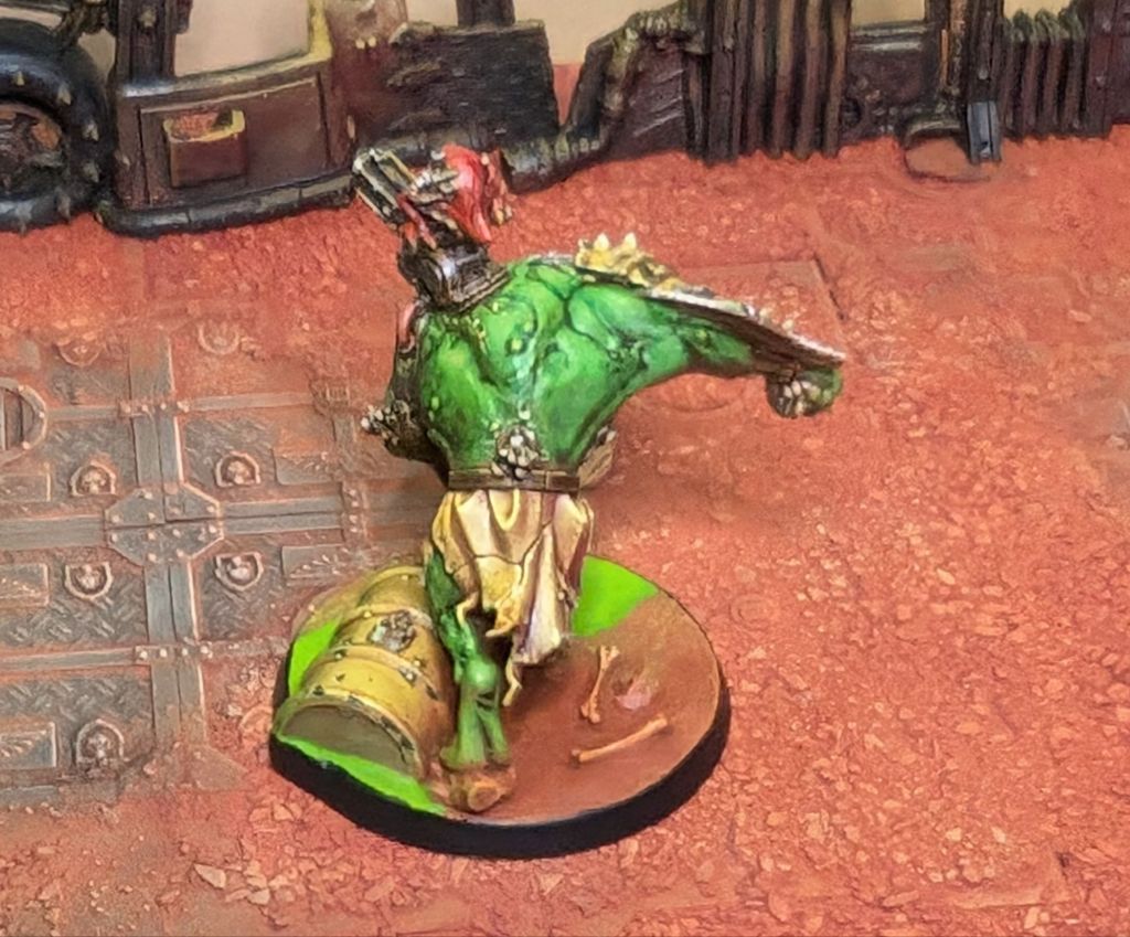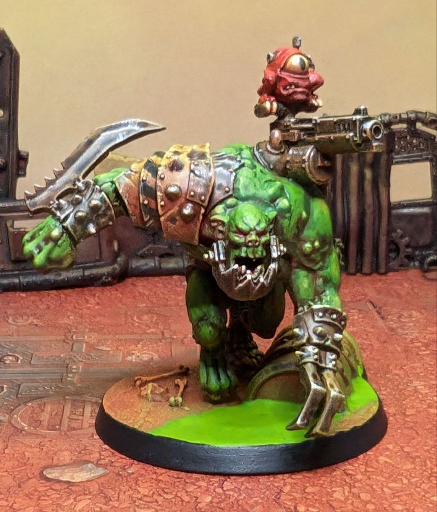 I’m not a huge fan of the official Beastboss miniature – the big fur coat gives it old-lady-at-the-opera vibes to me, and I wanted to explore the ‘toxic mutant’ theme of the army a bit more.  So, I shaved a Skaven (Shaven?) Rat Ogre and stuck an Ork head on it.  Actually fairly straightforward as conversions go, but removing all of the fur texture to give it the appearance of smooth(ish) skin was quite time consuming.