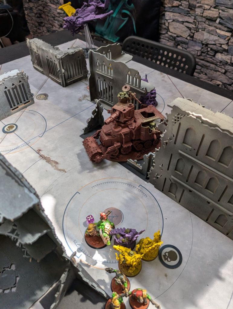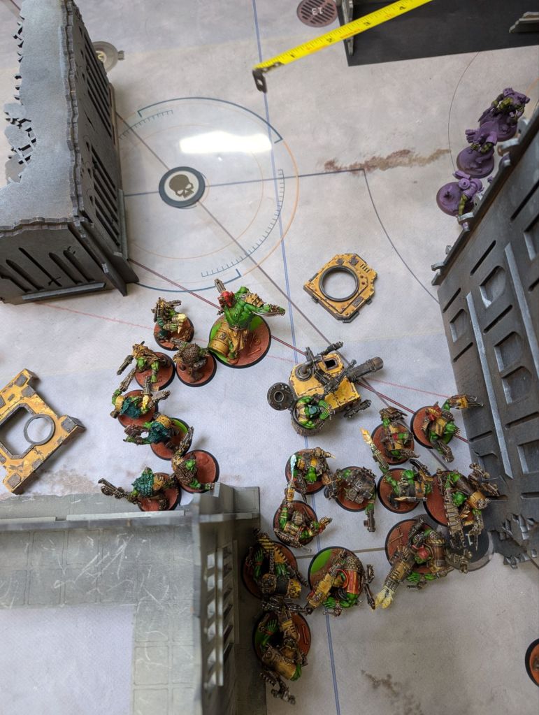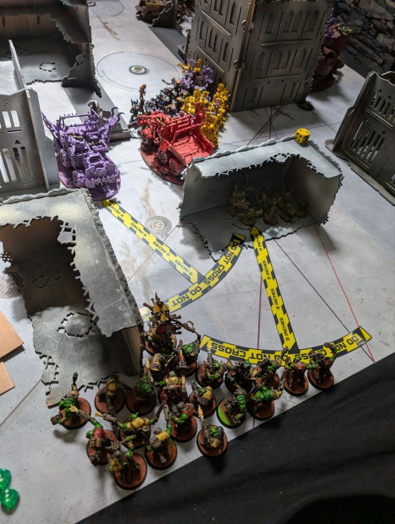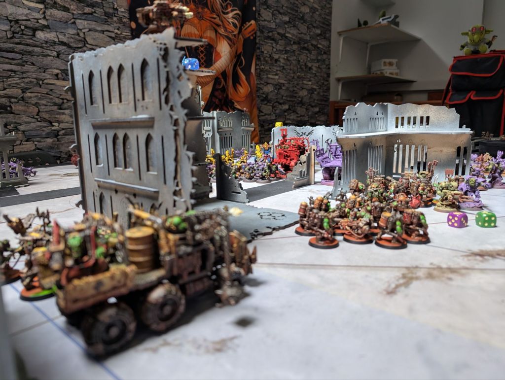 This was a 2,000 point crusade game of my (well, Uzblitz’s) Orks verses the Orks of Kaptin ‘Shiny Klawz’ Dimz playing the Dig Site Raid mission.
