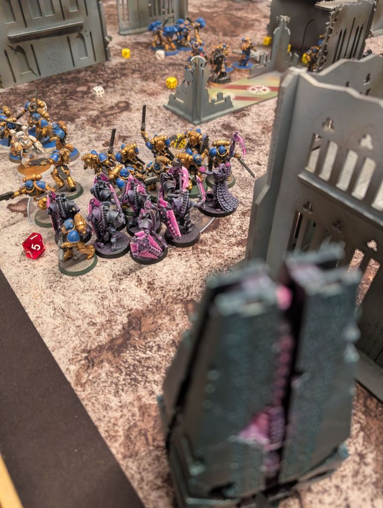 To her right a group of Flayed Ones were tearing apart an Astartes champion that had charged in a bit too eagerly. There was the crack of displaced air as marines teleported in behind their lines, swarming over and bringing down a Necron war machine. A second squad half-materialised for a second before their crude warp-based technology malfunctioned and they were whisked away with a daemonic howl.