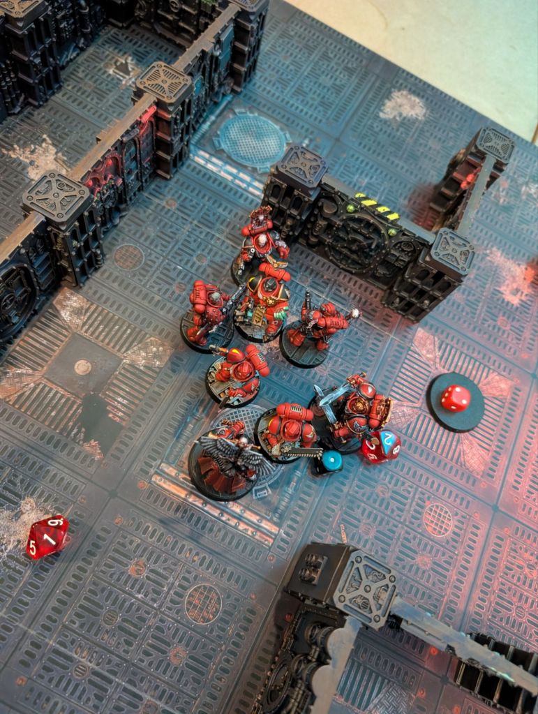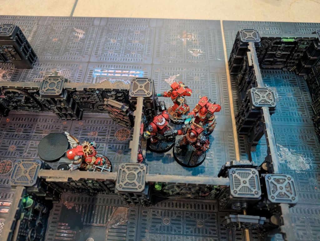 - My other big mistakes were Boarding-Actions-specific positional things. At the end of the first game my plan was to fall back with the surviving Terminator and then have the Bladeguard charge past to shield him from the pursuing Vanguard Vets, but forgot that in Boarding Actions even friendly models block movement, so the Bladeguard ended up not being able to get around him. In the second my Terminators were fighting the Aggressors through a doorway, which formed a chokepoint which meant only two Termies could fight at a time and I essentially got Thermopylae’d. Aggressor power fists are a bit better than Terminator power fists by virtue of being twin-linked and so in a 2v2 the Termies consistently came off a little bit worse.